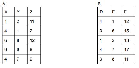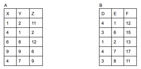 8. Consider the following relations A(X,Y,Z) and B (D,E,F) and find out how many tuples will there be in the result of the following relational algebra expression?